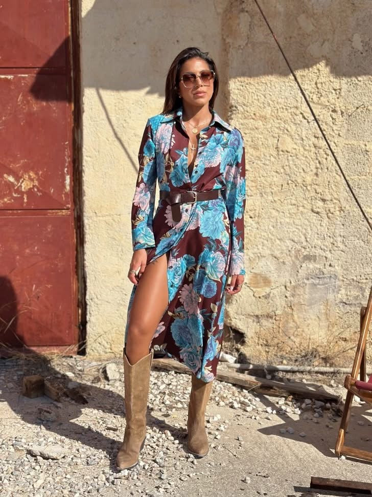 Φόρεμα σεμιζιέ με ζώνη από το ίδιο ύφασμα .